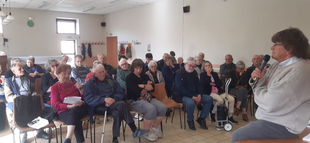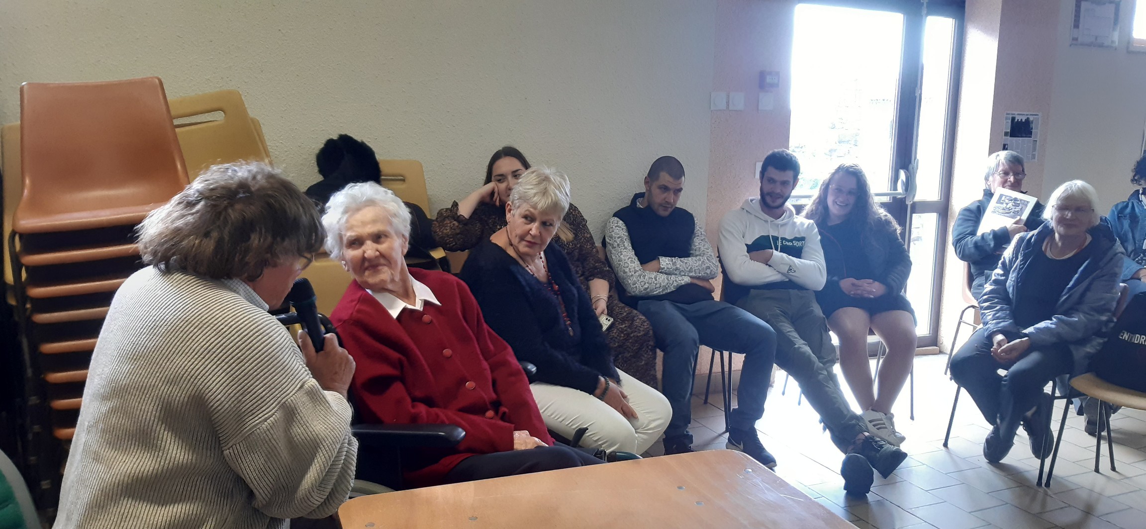 L’après midi la salle était comble pour participer à cet évènement. Les familles des centenaires étaient présentes ainsi que des amis, des habitants de la comme ou des communes voisines. La présence d’une centenaire citée dans l’ouvrage, Marie Marion née le 6 octobre 1924, fut un moment fort de cette manifestation ; surtout lorsqu’elle répondait du tac au tac à ses différents interviewers. Elle se rappelait qu’elle allait danser au dancing du « Pont des Rabeyrolles » situé au carrefour des routes de Landos et Rauret très proche du village de Jagonzac. Elle avait bien connu la famille Dumunier dont l’un des fils André fut maire de Saint-Haon. De même la famille Masseboeuf qui occupe actuellement sa maison natale à Jagonzac. Elle épouse Baptiste Marion en 1946. Le couple s’installe au village de Fourmagne commune de Saint-Paul-de- Tartas. Ils exerceront le métier d’agriculteurs. Ils auront 7 enfants. Un moment particulièrement émouvant, lorsqu ‘elle s’est trouvée face à face avec Claudius Demars, le collecteur de lait de sa ferme pendant 40 ans, on disait alors le « ramasseur », et qui prenait le temps de boire le café.