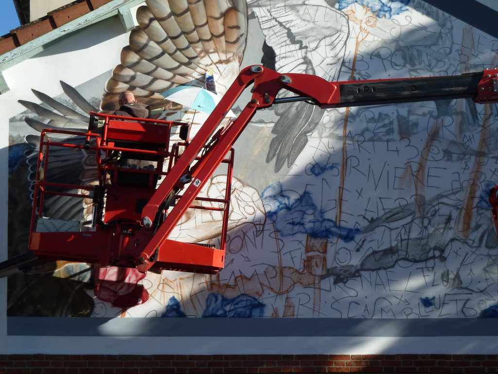 Perché sur une nacelle, l’artiste peintre pense terminer l’œuvre choisie dans quelques semaines.