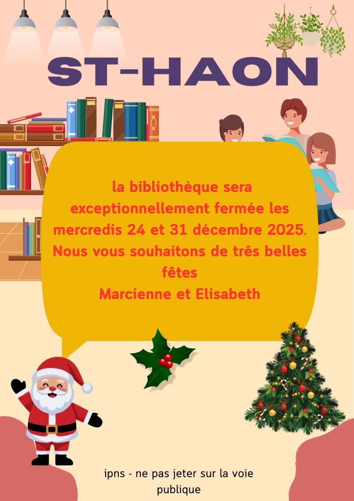 Actualités Fermeture de la bibliothèque les 25 et 31 décembre par pol 8 décembre 2025 Navigation de l’article Article précédent : Animation lecture « En attendant Noël » à la bibliothèque samedi 13 décembre