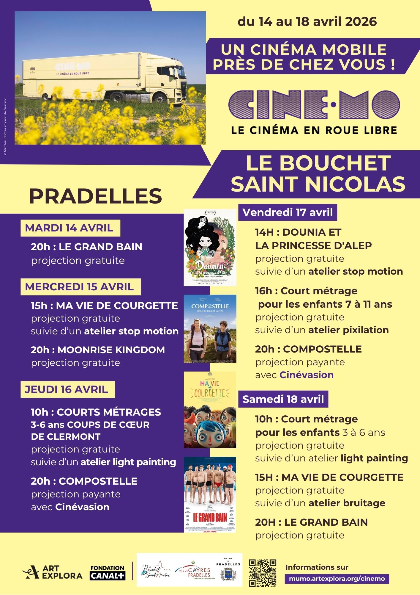 Le CinéMo sera présent du mardi au jeudi à Pradelles, sur la Place du Foirail, puis du vendredi au samedi au Bouchet-Saint-Nicolas.